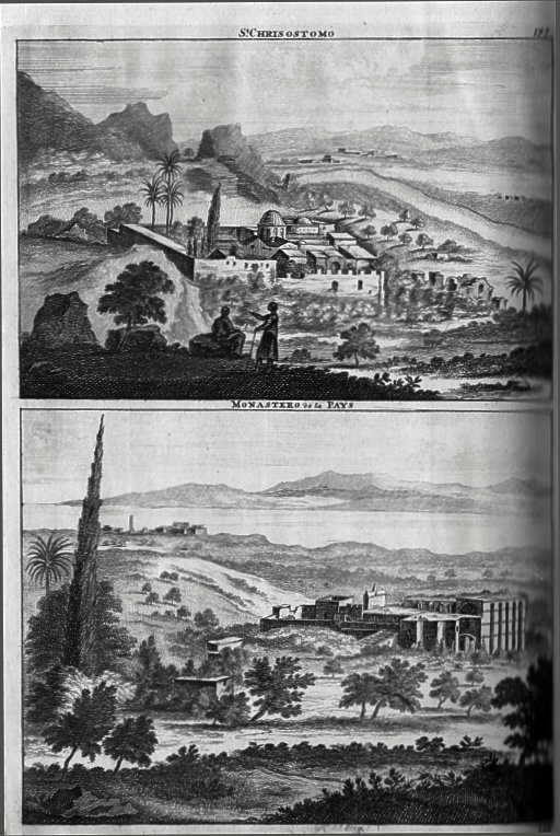 | St. Chrisostomo and Monastero de la Pays. 17.5 x 26 cms. Plates 197 and 198. ".......It is pretty large and surrounded with a good wall, some of its apartments are after the modern fashion, having lately been rebuilt after a fire which consumed a great part of the structure. The Church, which is as it were divided into two parts, is 48 foot long and 28 foot wide. On the top of these parts there is a little dome a great image of Jesus Christ painted at half length, and several other figures round about it, but are almost all defaced. Eight pillars fastened to the wall support this dome. The altar is adorned with a great deal of guilt branch work which was not done above five years ago. In this church is buried a Princess, who it is said formerly built that structure, whose ruins are seen on the top of the mountain. There are also two slaves buried, one on her right, and the other on the left side. There are 14 steps to go to the top of this church where there is a Grott, in which it is said the Turks formerly found a great coffer of Gold. There is also a small chapel seen in this monastery, but it is quite ruined. The place which serves for the kitchen is 36 foot long and 18 foot wide. The superiority is exercised there by a Father Guardian who has under him three priests and eleven monks. These religious have within the inclosure of the monastery a small garden in which there are some orange trees.........." "....... we must not forget to mention here on what occasion the monastery was built. The Princess whom we have said to be buried there did live in the building which is on the top of the hill, to the end she might be the better secured by the Violence of the Templars, who in those days endeavoured to make the themselves Masters every where. Besides this trouble she had likewise the misfortune of being afflicted with a sort of an ulcer or scab. A little dog whom she loved passionately, and who never left her, was infected with this evil; but as soon as he found himself seized with it, he went down the hill every day and was absent an hour or two before he returned, and as he continued to do this he mended visibly. Notice was taken of it, and it was found that this dog bathed himself in a fountain not far from thence. The Princess feeling the effect which this had on her little dog, resolved to make trial of it for herself, which succeeded so well, that in a few days she was cured of her evil, and recovered her former health. And to show her gratitude to God she caused this Monastery to be built for the Greek monks, and gave it the name of St. Chrysostom, under whose protection she put the same. It has retained the name to this present, and the same virtue is still attributed to this Fountain, where several persons come daily to bath themselves, and are cured, as is pretended. Another prospect of this Monastery is to be seen as it was taken from a high hill in plate 197........" ".........The next morning we took our way to the Monastery of Peace ( which is said to be built by the Templars this is for the most part very difficult to travel, being across the mountain, having past the mountain and coming near the Monastery it appears pleasantly situated in a wood surrounded with orange, olive, palm and other fruit trees, above which tops a very high cypress. This pleasant object obliged me to sit down and take a draught of it on paper, as is seen in plate 198......" Price: CyP 300 |