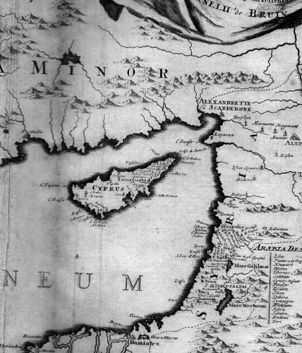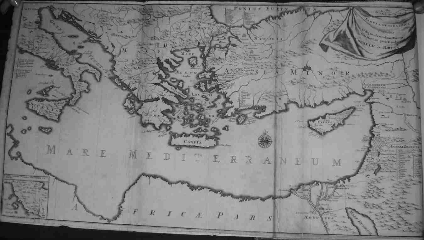 Tabula Geographica Continens Vestigia et Procebum Itineris Tam Maritimi quam Terrestris Cornelii de Bruin. Folding map of the Eastern Mediterranean basin extending from Venice in the west to Aleppo and the Euphrates in the east, with an inset map of Rome and its surrounds. Compass rose and decorative cartouche at top right corner.57 X 31 Cms. Minimal soiling at folds. Rebacked and matted ready to frame. Price: CyP 550.00 |