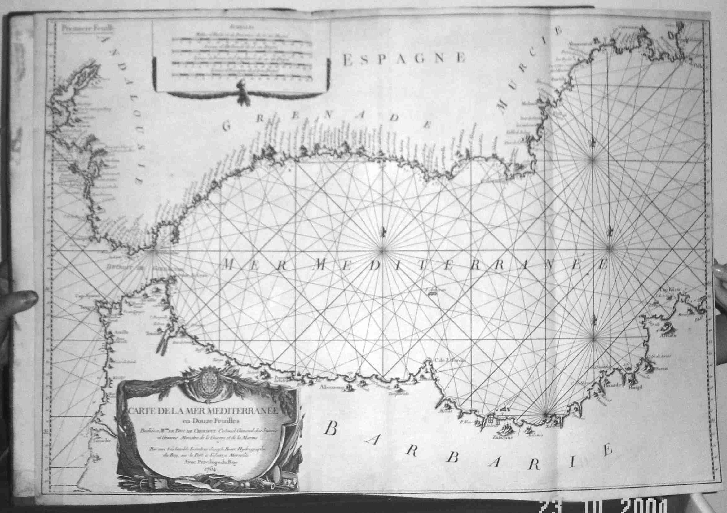 | Plate I. 80 x 56 cms. Chart extends from the Isle of Cadiz , Tangiers , and the Straits of Gibraltar in the west to the port of Oran in the east and from the coast of Grenada in the north to the coast of Morocco in the south. Two original folds. Right margin cut close; however as published. Edge of top margin a little rough. Price: CyP 600.00 |