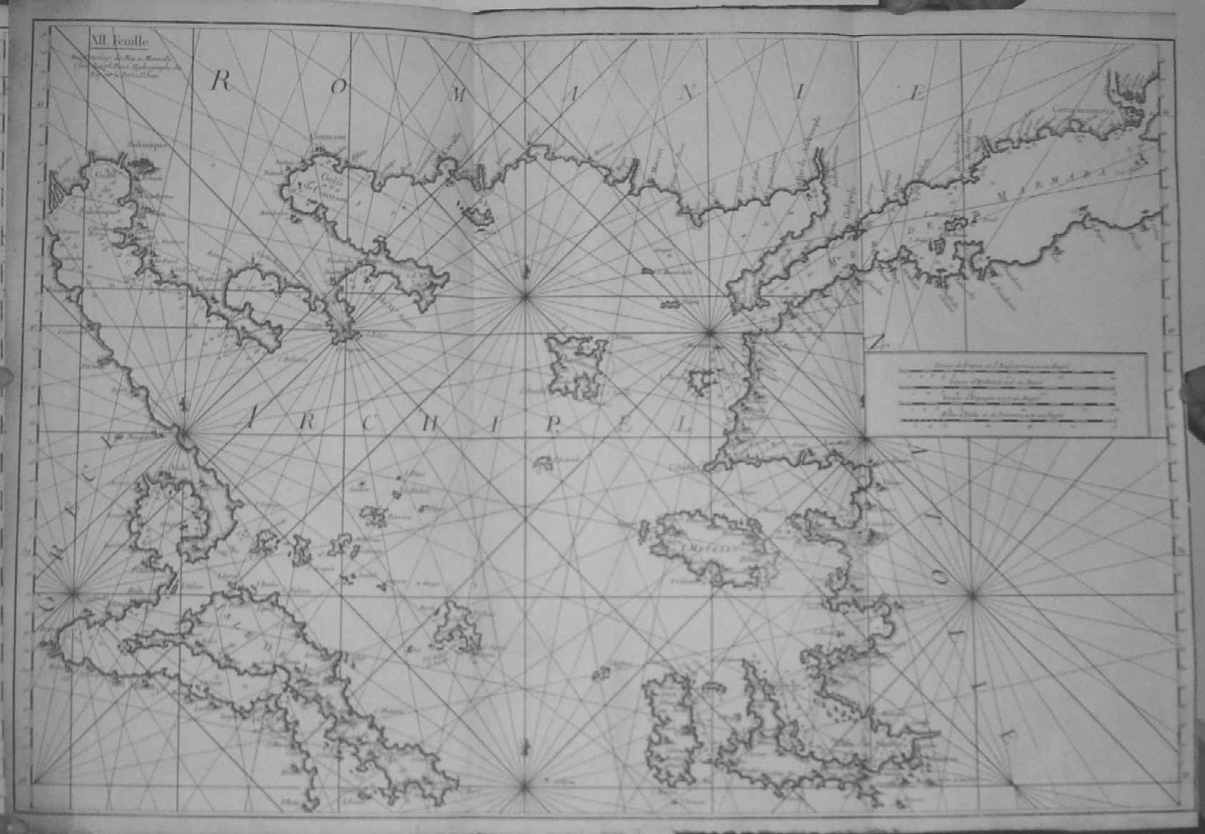 | Plate XII. 81.5 x 55.5 cms. Chart of the northern Aegean, the Sporades and the Dardanelles, extending from the Gulfs of Salonika and Evoia in the west to Constantinople and Mytelene in the east and from Thasos and Samothrace in the north to Evoia and Chios in the south. Two original folds and right margin cut close, as published. Edge of bottom margin a little rough. Price: CyP 800.00 |
