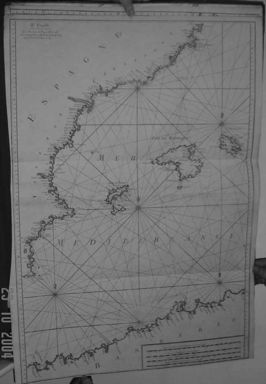 | Plate II. 81 x 55 cms. Chart extends from Alicante and the Gulf of Valence in the west to the Isle of Minorca in the east and from Catalonia and Barcelona in the north to the coast of Algeria in the south. The Balearics are in the centre and in beautiful detail. Two original folds, bottom margin cut close as usual with a small hole at left marginal line at 40.05 degrees, not in map area. Price: CyP 700.00 |