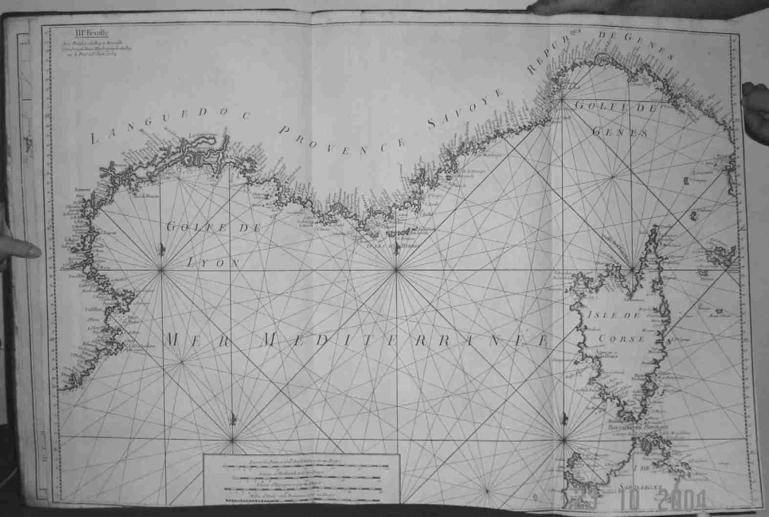 | Plate III. 82 x 56.5 cms. Chart extends from the Gulf of Lyons in the west to the Isle of Elba in the east and from the Gulf of Genoa in the north to the tip of Sardinia in the south. Corsica in beautiful detail. Right hand marginal cut short ( as published ); two original folds. Price: CyP: 700.00 |