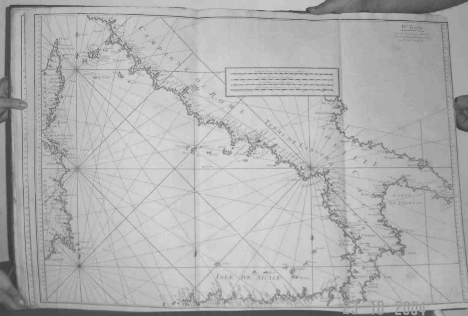 | Plate IV. 81 X 55.5 cms. Chart extends from the eastern tips of Corsica and Sardinia in the west to the port of Brindisi and the Gulf of Tarento in the east and from Elba in the north to Messina and the tip of Sicily in the south. Two original folds and right hand margin cut short, as published. Price: CyP 700.00 |