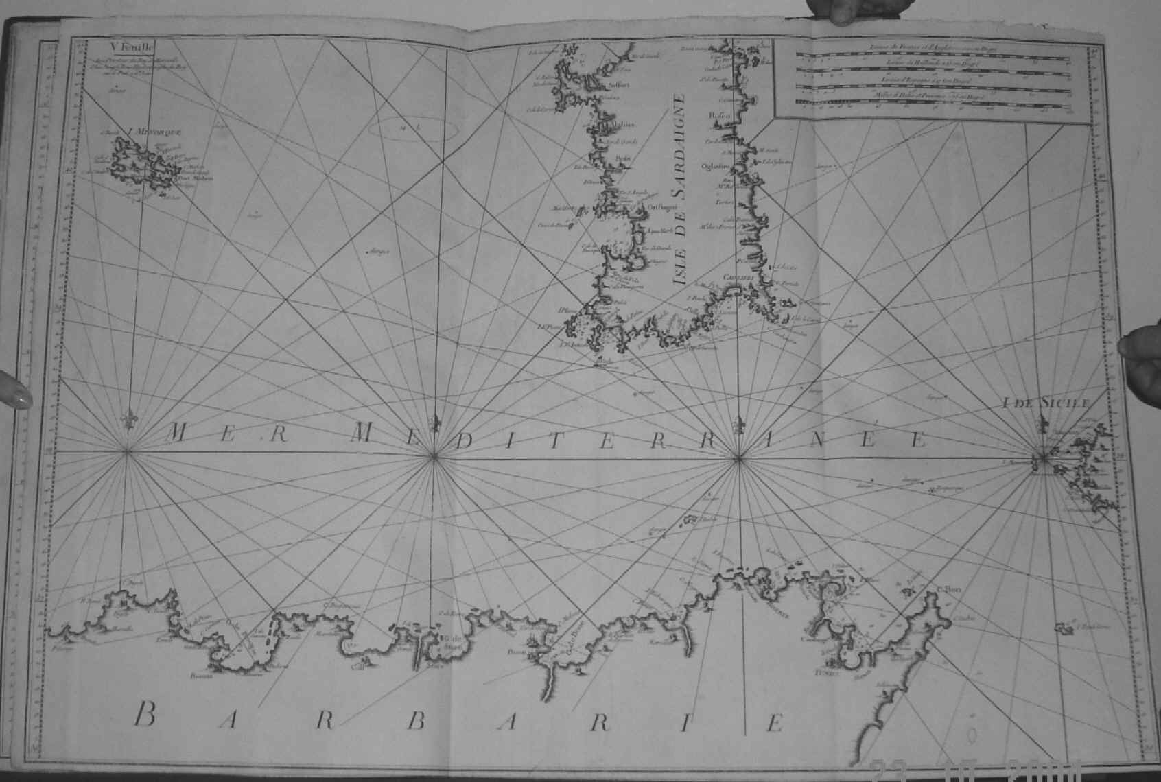 | Plate V. 56 x 81 cms. Chart extends from the Isle of Minorca in the west to the western tip of Sicily and the Isle of Pantelaria in the east , and from Sardinia in the north to Tunisia in the south. Two folds and bottom margin cut close, as published. Price: CyP 700.00 |