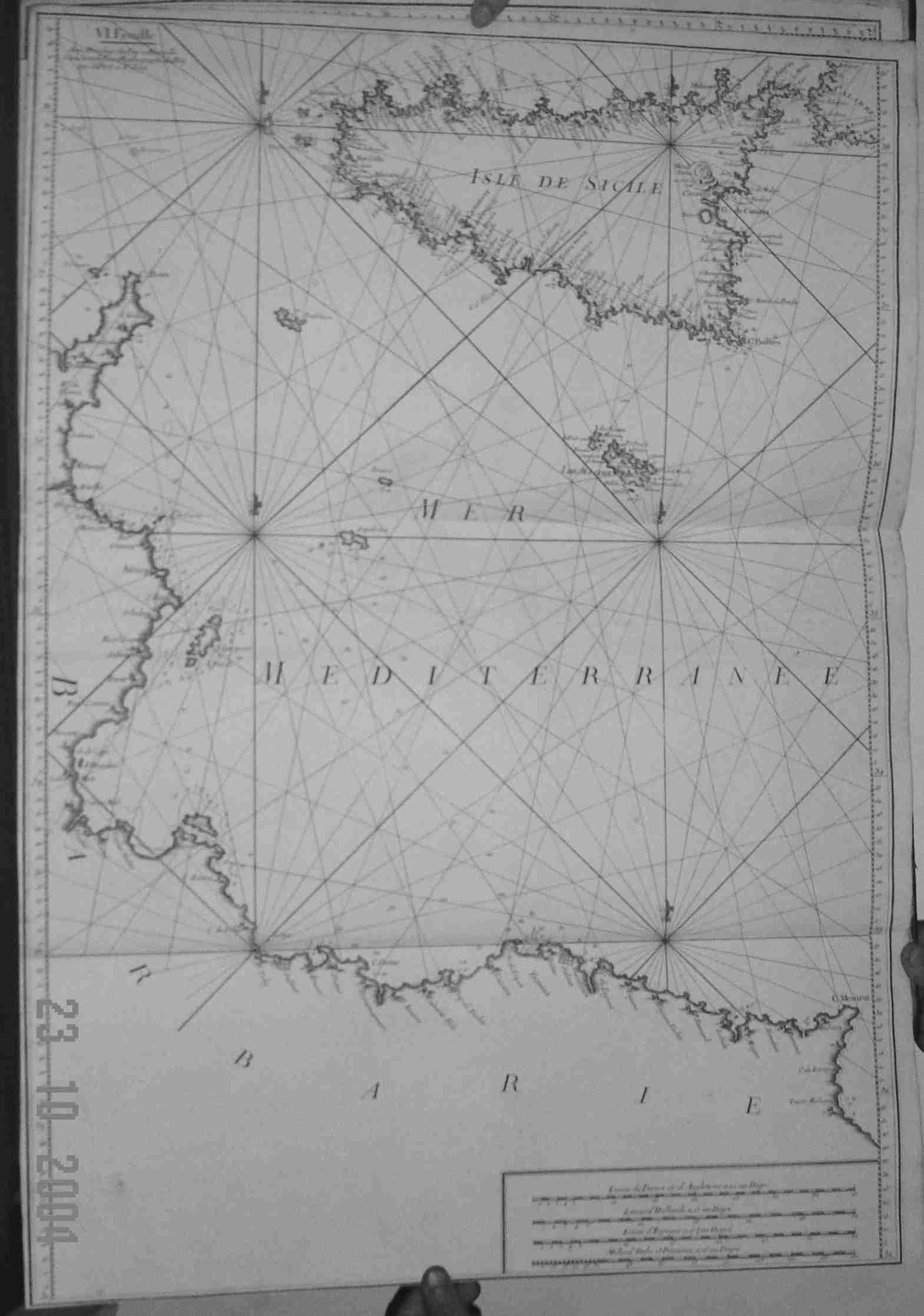 | Plate VI. 56.5 x 80 cms. Chart extends from eastern Tunisia in the west to central Med Sea in the east and from Sicily in the north Tripolis and western Libya in the south. Malta is in the center in beautiful detail. Bottom margin cut close, two original folds as published. Price: CyP: 700.00 |