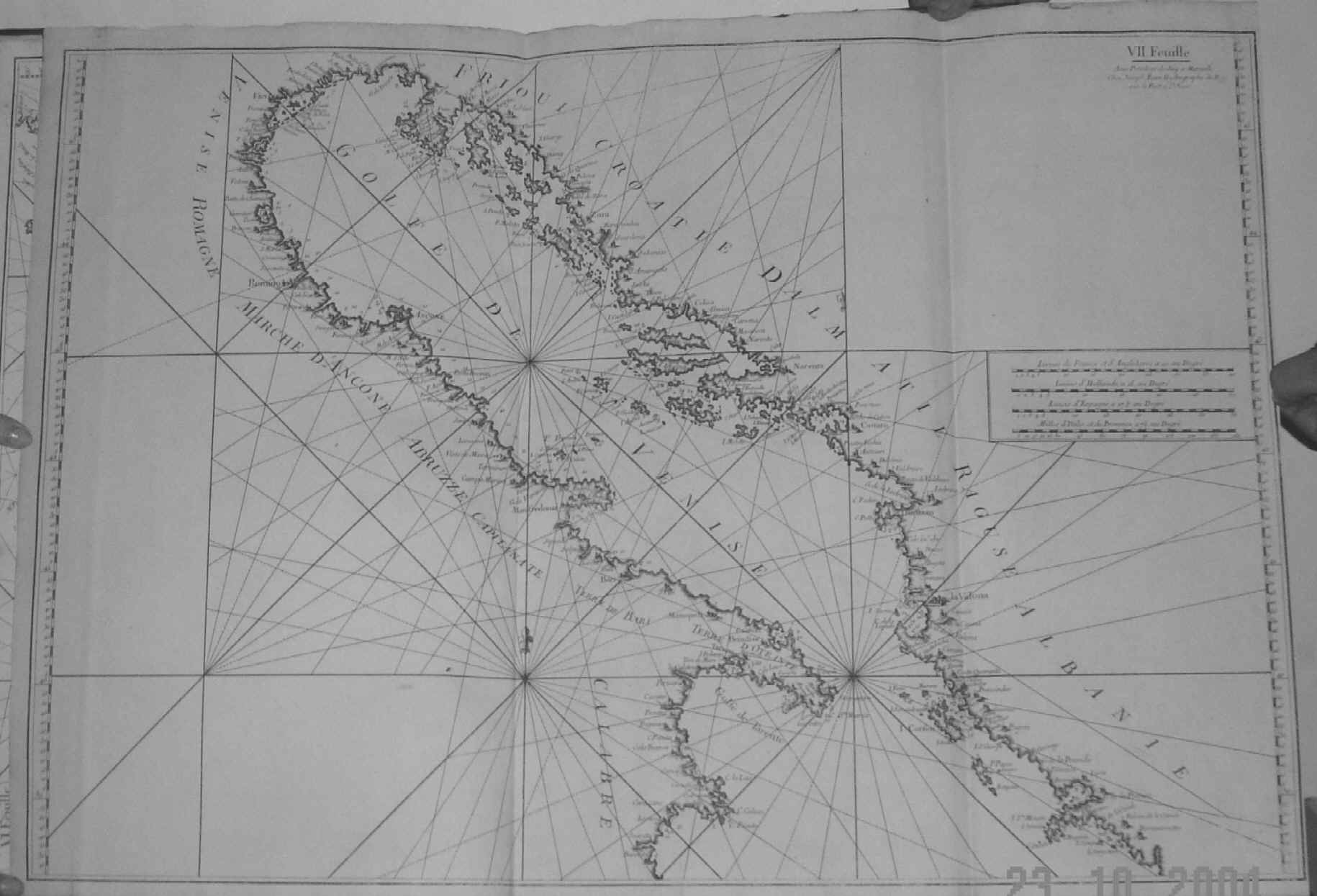 | Plate VII. 80 X 55 cms. This chart is essentially of the Adriatic and north Ionian Seas and coastal areas of east Italy, the Dalmatian and Albanian coastline, and north western Greece with the Gulf of Prevesa and the Isles of Corfu and Paxu in the extreme south east. Two original folds and the right hand margin cut close, as published. Price: CyP: 700.00 |