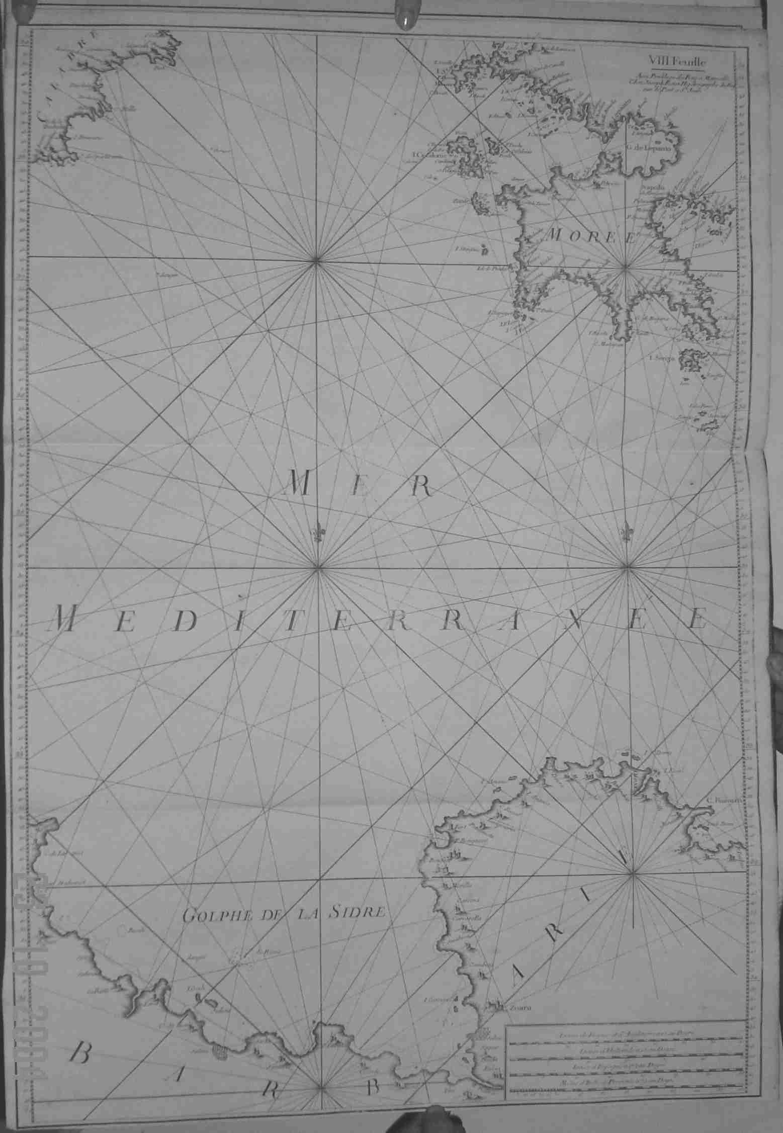 | Plate VII. 56 x 81 cms. Chart extending from the tip of Calabria in the west to the Aegean in the east and from Leucas, Zakynthos and the Peloponese in the north to the Gulf of Sidre in Libya in the south. Bottom margin cut close, as published, and two original folds. Price: CyP 700.00 |