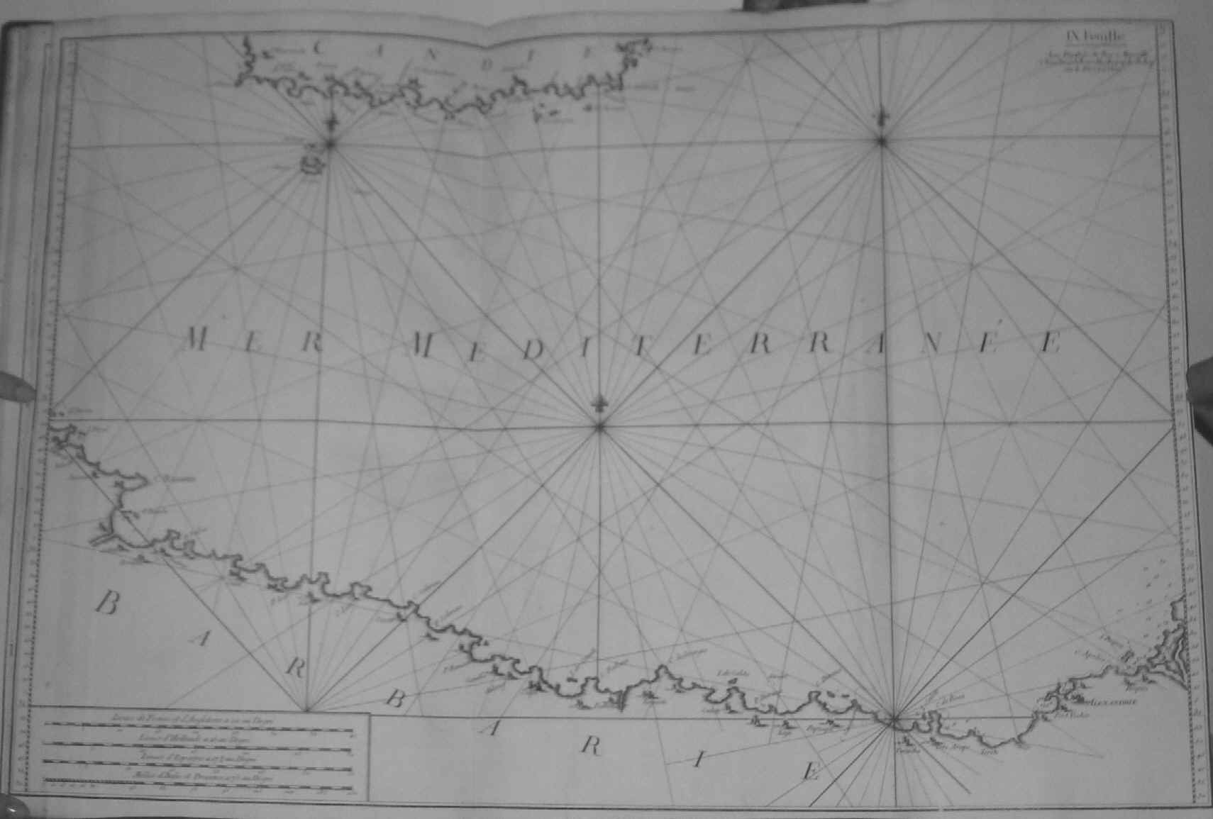 82 X 55 cms. Chart essentially extending from southern Crete and Gavdos in the north to eastern Libya and Alexandria in Egypt in the south. Two original folds and both left and right margins cut close; as published.