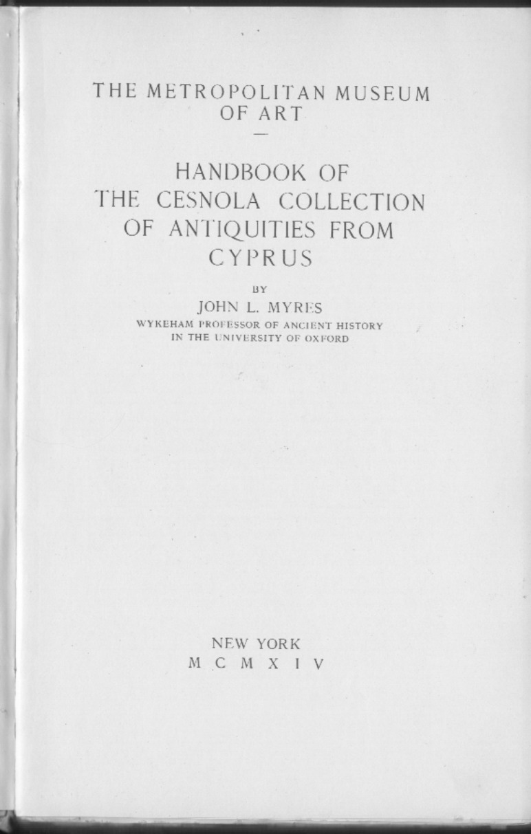 " This Handbook is intended to serve as a guide to the Cesnola Collection of Antiquities from Cyprus, or more precisely to those parts of which which are exhibited in the Cesnola Room and other departments of The Metropolitan Museum of Art. It offers at the same time an introduction to the study of the ancient arts and industries which the Cesnola Collection was formed to illustrate. But it is not in the strict sense a Catalogue of the Collection, though all the more important objects are described separately..... " from the Preface. Price: CyP 400.00 |