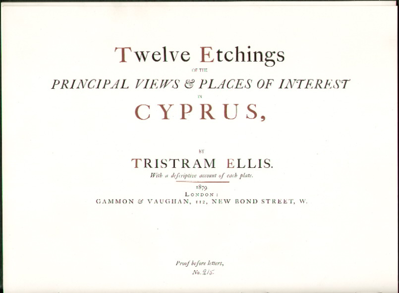 40x30cm (folio), dark green cloth gilt, 12 etchings + text. Rep. Facsimile reprint of 1879 Gammon & Vaughn London edition; limited to 500 copies. This is number 215. Subjects of the etchings: The Marina Larnaca, from the Konak Pier; Nicosia from Government House; Nicosia - Saint Sophia; Famagusta Harbour; Famagusta -St Sophia, sunset; Famagusta by Moonlight; Bellapais Monastery; Kyrenia Port, sunrise; Troodos - the Stone Firs; Troodos the summit; Ploughing in Cyprus; Paphos Harbour; (frontispiece untitled of a woman with a spinning wheel).