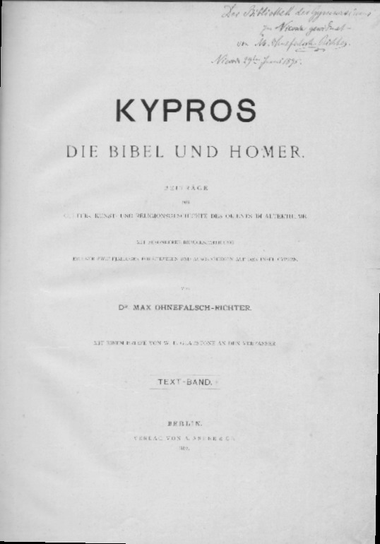 Kypros. Die Bibel und Homer. Beiträge zur Cultur-, Kunst- und Religionsgeschichte des Orients im Altherthume mit besonderer Berücksichtigung eigener 12-j. Forschungen und Ausgrabungen auf der Insel Cypern.