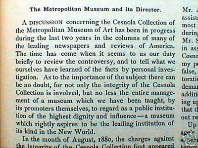| 1882 MAGAZINE ARTICLE. CESNOLA COLLECTION CONTROVERSY AT THE METROPOLITAN MUSEUM OF ART. This is a rare magazine article from the August 1882 issue of The Century Illustrated Magazine … “THE METROPOLITAN MUSEUM AND ITS DIRECTOR”. This informative, 10-page article covers in an evenhanded, thorough manner the intense controversy swirling around New York over the archaeological collection brought to New York by General di Cesnola from Cyprus. After the collection had appeared at the Museum to rave reviews, experts had questioned the authenticity of a good portion of the objects in the collection. Cesnola defended the collection’s authenticity, but charges and countercharges were flying back and forth in the city newspapers. This article presented all sides of the controversy employing the best archaeological experts and relevant witnesses. This is a significant piece of archaeological, New York City, and Metropolitan Museum history. It is an authentic 122 year-old magazine article and a great source of art and archaeology history. There are facts, observations, and insights here not to be obtained in any of today’s sources. The article is in good condition with minor age-toning. Pages are approximately 6 ˝ by 9 ˝ inches. The article comes rebound in a plastic protective binder Price: CyP.12.00 |