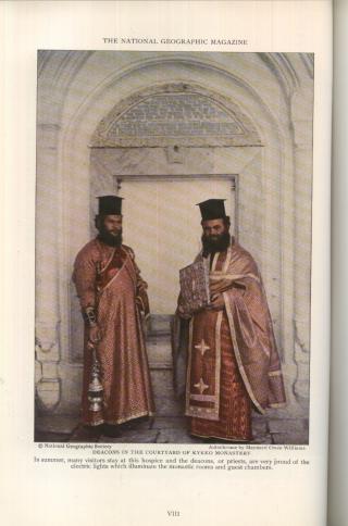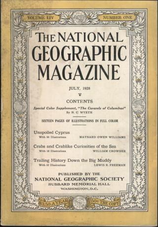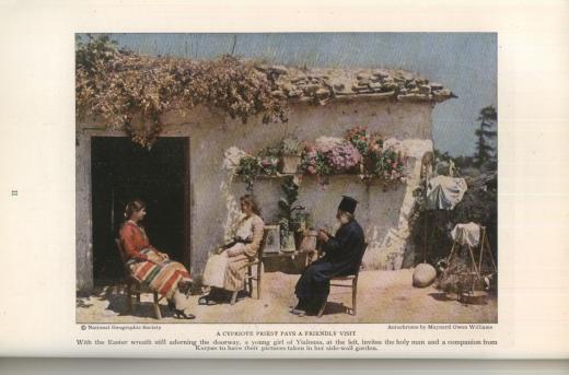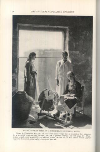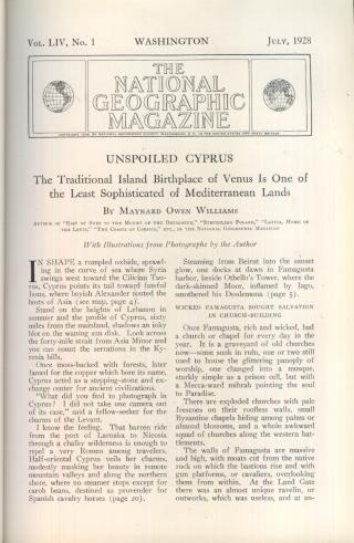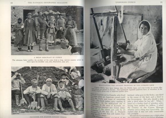 | The National Geographic July 1928. This is an old item on the island of Cyprus and has over 60 photographs of the land and people of Cyprus. This is a huge article in a complete journal of National Geographic from 1928. Although there are other articles in this journal, the main feature article is on Cyprus and it is a very large article containing 55 pages with 64 old photographs all on Cyprus. Much information and photographs on the dress, customs, work, art and daily life of the people of Cyprus in the 1920's. There is over 150 pages total including the old advertisements in this 77 year old journal. Original and all complete minus any added supplements. Every page and photographs is present. Original covers has some wear and some minor discoloration. Price: CyP 25.00 | ||