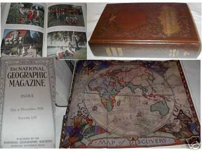 Bound volume of six issues with the front wrapper of July 1928, bound in the front with the Index, lacking rear wrappers & ads. Profusely illustrated with black & white and color photographs. Articles include: In good condition. Ex-Lib. This volume is embossed decoration and globe w/ gilt airplane on top and gilt title on front board. Brown Fabricoid cloth binding is made to look like leather. It is over sewed in accordance with American Library Assoc. specifications and bound in Albrect Super-Covers, represent one of the strongest and most attractive bindings ever offered. Chateau Land--France's Pageant on the Loire; Glories of theMinya Konka: Magnificent Snow Peaks of the China-Tibetan Border Are Photographed at Close Range by a National Geographic Society Expedition; New Alphabet of the Ancients Is Unearthed: An Inconspicuous Mound in Northern Syria Yields Archeological Treasures of Far-reaching Significance; Perennial Geographer: After 2,000 Years Virgil Is Still the Most Widely Read of Latin Poets--First to Popularize the Geography of the Roman Empire. Unspoiled Cyprus, Trailing History Down the Big Mud, Crabs and Crablike Curiosities of the Sea, The Caravels of Columbus. Nature and Man in Ethiopia, The Balearics, Island Sisters of the Mediterranean, Spain's Enchanted Isles, Archeology, the Mirror of the Ages. Fate Directs the Faltering Footsteps of Columbus, The Enigma of Cambodia, A Voyage to the Island Home of Robinson Crusoe, Four Faces of Siva: The Mystery of Anchor. Our Conquest of the Pacific, The Granite City of the North, Sweden; Land of White Birch and White Coal. The Kizilbash Clans of the Kurdistan. The World's Greatest Overland Explorer, Venice; Home City of Marco Polo, Life Among the Lamas of Choni, Fame's Eternal Camping Ground. Renascent German, Through Germany with a Color Camera, Seeing 3,000 Years of History in Four Hours, Mickey the Beaver. Price: CyP 36.00 |