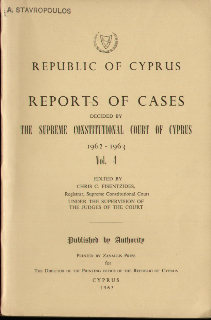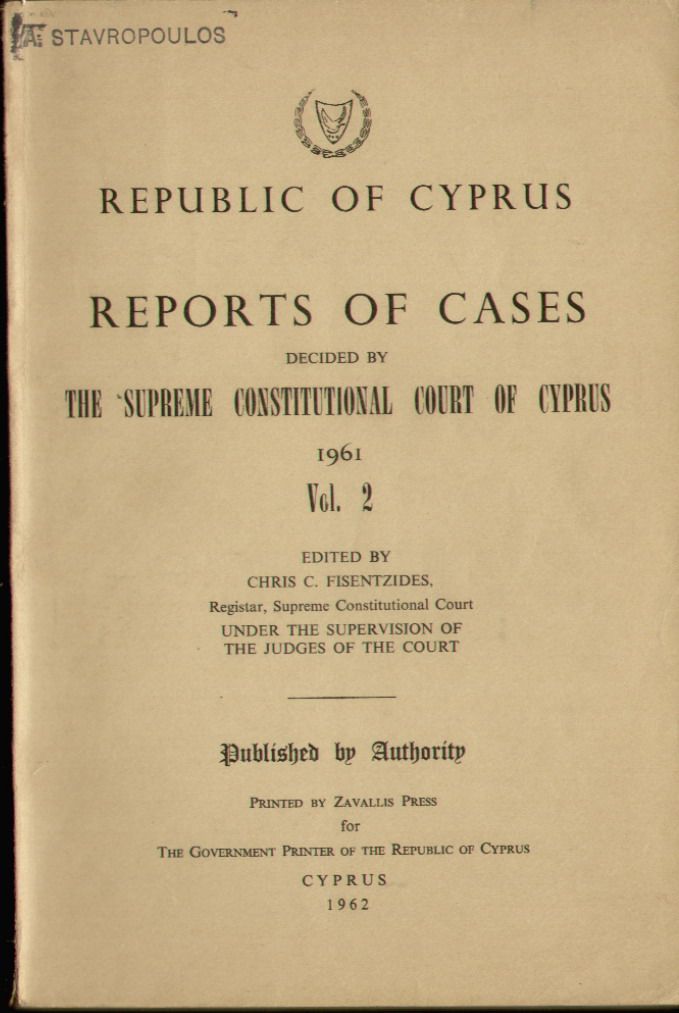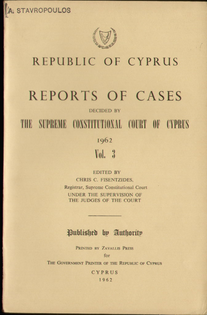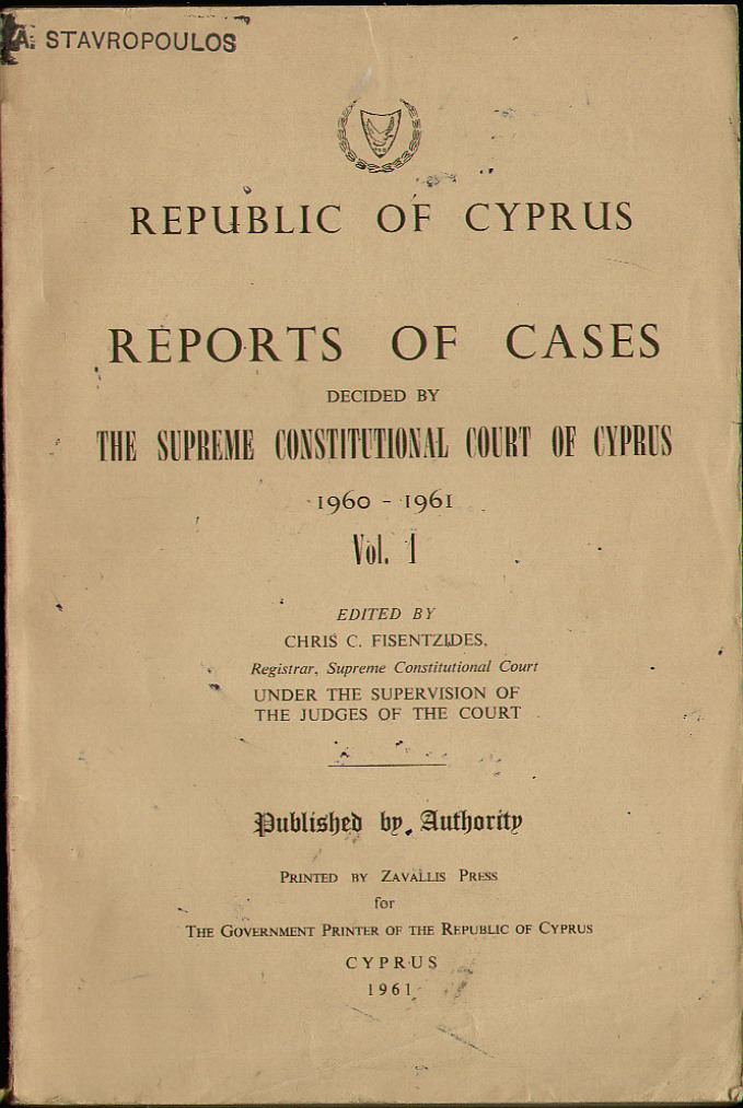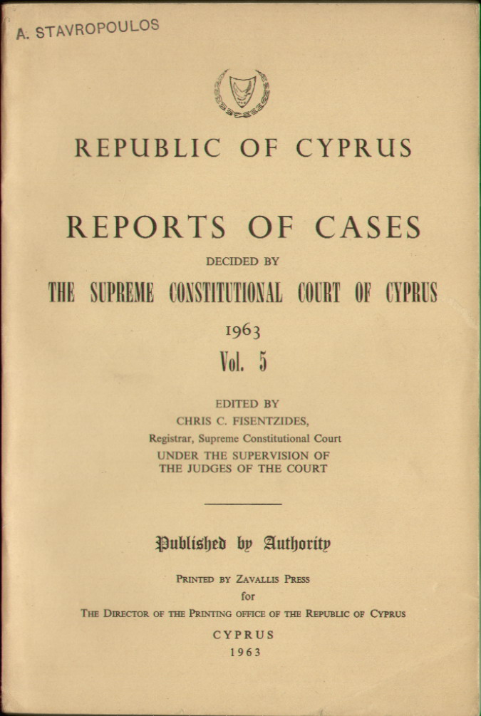 | Set of 5 Volumes of The Republic Of Cyprus Report of Cases Decided by The Supreme Constitutional Court of Cyprus. Edited by Chris C. Fisentzides, Registrar, Supreme Constitutional Court. Published by Authority for The Government Printer of The Republic of Cyprus. Volume 1: Judges of the Supreme Constitutional Court 1960-1961. Professor Dr. Ernst Fordyhoff, President; Michalakis Antoniou Triantafyllides, Greek Judge; Mehmet Nedjati Munir, Turkish Judge. There are 20 Cases Reported, some of which include: The Holy See of Kitium and The Municipal Council of Limassol; Solomou, Eleni and Loucaides Georghios as Chairman, Village Water Commission of Katydhata & the Republic, Through the District Officer, Nicosia & Director of Water Development. Volume 2: Judges of the Supreme Constitutional Court 1961. Professor Dr. Ernst Fordyhoff, President; Michalakis Antoniou Triantafyllides, Greek Judge; Mehmet Nedjati Munir, Turkish Judge. There are 25 Cases Reported, some of which include: In Re- The Superintendent of Gendarmerie and Christodoulos Antoni Hadji Yianni of Petra; 1. Stelios E. Evlogimenos 2. Yiannoula Floridou, 3. Sofia G. Floui and the Republic of Cyprus, Through the District Lands Officer, Limassol. Volume 3: Judges of the Supreme Constitutional Court 1962. Professor Dr. Ernst Fordyhoff, President; Michalakis Antoniou Triantafyllides, Greek Judge; Mehmet Nedjati Munir, Turkish Judge. There are 39 Cases Reported, some of which include: Elias Petrou and Others of Karpasia, and the New Cooperative Credit Society of Karpasia; Ex Parte: Samuel N. Samuel of Nicosia. Volume 4: Judges of the Supreme Constitutional Court 1963. Professor Dr. Ernst Fordyhoff, President; Michalakis Antoniou Triantafyllides, Greek Judge; Mehmet Nedjati Munir, Turkish Judge. There are 27 Cases Reported, some of which include: In Re - Osman Saffet, and 1) The Cyprus Palestine Plantations Company Ltd., of Limassol, 2) Clough Smith & Co. (Middle East) Ltd, of Nicosia. Volume 5: Judges of the Supreme Constitutional Court 1963. Professor Dr. Ernst Fordyhoff, President; Michalakis Antoniou Triantafyllides, Greek Judge; Mehmet Nedjati Munir, Turkish Judge. There are 12 Cases Reported. All Volumes have a stamp on the front top left corner " A. Stavropoulos.." Volume 1 has a dedication on the Title page. Volume 2 has some pencil markings within the book. - The others are clear. A must-have set for the aspiring solicitor, barrister or politician. Bind them all together or separately. Price: CyP 120.00 |