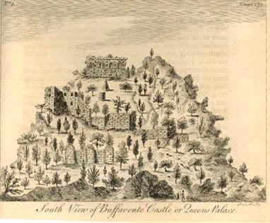 | South View of Buffavento Castle or Queens Palace. Image size: 19.3 x 14.5 cms. " ..... In my way to Saint Chrysostomos I crossed a field where perpendicular strata of stones run along the surface like so many foundations of walls. The convent of which this saint is protector, I found a large though mean building; some parts are of good marble, well wrought, and tolerable mosaic of variegated stones, with a great deal of gilding and painting; but nothing is of a piece. The superior had no records, which indeed none of them have, but he told me it was founded by the king's daughter, who built the spitia tis Reginas, upon the top of an almost inaccessible rock two miles further up in the mountains..........." |