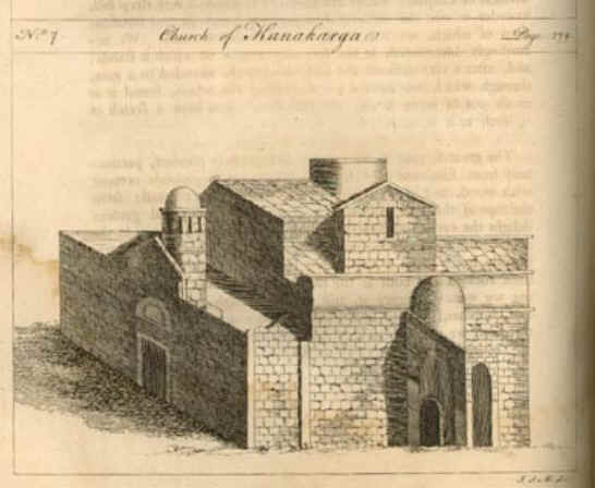 | Church of Kanakarga. Image size: 19.3 x 14 cms. "....... We returned through a variety of good and bad, beautiful and bleak grounds, until we arrived at the convent Canakarga; where, recollecting that it would be proper to give you an idea of a Greek church in their true taste, I pulled out my pencil and made the sketch to save myself the trouble of drawing and measuring, and you that of considering, an ichnographical plan: I shall only inform you that it is built exactly according to the mode of the ancient Greek churches, which, you know, consisted of a narthix or porch, a pronaos or outward chapel, a naos or nave, the vema or chancel and the thysiasterion or altar......" |