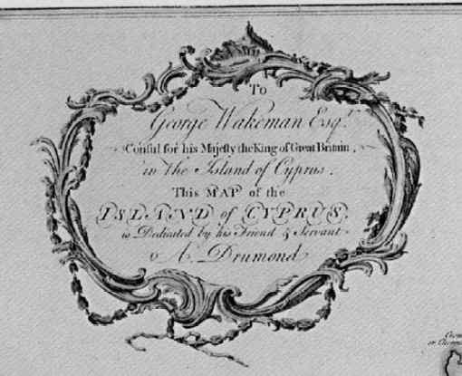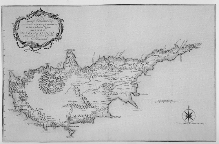 | To George Wakeman Esq. Consul for His Majesty the King of Great Britain, in the Island of Cyprus. This Map of the Island of Cyprus is Dedicated by his Friend & Servant A. Drumond. 1754. London. Image size: 75 x 48 cms. Decorative cartouche, Compass Rose and Scale in British Leagues. | |