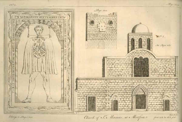 | Church of Saint Acheropeto.( left). 12.3 x 19 cms. Church of St. Mamas, at Morphou.. from a. to b. 58 1/2 feet. (right). 18.5 x 19 cms. "...... I had a very agreeable ride to Lapitho. This town is said to have been built by Belus, and stands agreeably on the rocks of the shore, whence the harbour seems to have run far to the westward; but it has no river, and yet all the grounds of the slope from the mountains are fertile and pleasant, bearing great numbers of natural and planted trees..... ..and some grand buildings, particularly one, the foundations of which I have partly traced: the wall was two feet deep, and fifty seven feet long; the front thirty six feet broad, and in the center of the west side was a space of six feet, where no foundation was to be seen; I therefore suppose this to be the width of the gate: the flooring is mosaic, very neat work. Perhaps another person would have found out a temple in this vestige; hut I chuse to represent only what I saw, and leave you to your own conjectures. In the church of Saint Acheropito I found the monumental stone, the drawing we have at No. 2 (left). The work is so that it cannot deserve the name of basso relievo, yet I would willingly give you specimens of everything by which you may judge of Cyprian taste; as for this performance, it is but about two hundred years old...." "......from hence ( Capo de Gato ) the country is open and pleasant to Colos, which is a fine village, where there was formerly a commanderie of the Knights Hospitallers. Lewis de Magnac, grand commander of Cyprus, built, in this place, a plain square, and strong tower, which still remains; the front exhibiting this appearance...' ( upper center in plate) ".....Morfou is a very cheerful place, about a league and a half from the sea, and its church is the handsomest building of its kind in the whole island; the court is finely walled with hewn stone, about fourteen feet high, extending to two hundred and fifty two feet in front, one hundred and fifty six feet on each side........ It was almost finished, in a kind of Italian taste, when the Turks conquered the island and any improvement was nipped in the bud by the irruption of the barbarians...... Saint Mamas, to whom this church is dedicated, performed abundance of miracles while he lived upon earth.......... Just above the place where he lay interred, a marble sarcophagus was placed, and on the wall is a picture representing him riding on the lion, with the lamb in one hand and a shepherd's crook in the other: upon his right is St. George, and on his left Saint Demetrius , both on horseback. The Turks, expecting to find a treasure in this sarcophagus, broke it up; and ever since, through two little holes, which were then made, water is continually conveyed into a hollow, being supplied from the sweat that issues from the face of the above picture....." ( right ) |