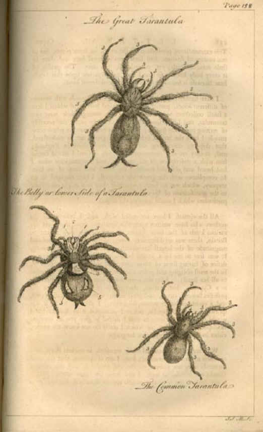 | The Great Tarantula.The belly or lower side of a Tarantula.The Common Tarantula. Image size: 19 x 30 cms. "..... I have formerly observed that the country abounds with vermin of different kinds, particularly reptiles and insects, of which I sent a small collection back to a friend in Britain; amongst these were two tarantulas.. with regard to the animal itself, we often, in ancient story, find mention made of the arachne; but, I am of opinion, that the word tarantula was not known to the old Grecians, and the modern Greeks call it pòba; at least, I can learn no other name........" |