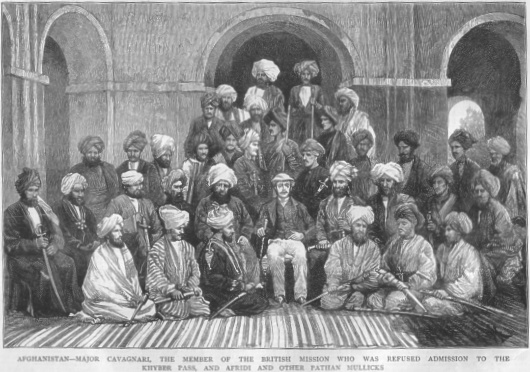 | 32. Afghanistan. Major Cavagnari, the member of the British Mission who was refused admission to the Khyber pass, and Afridi and other Pathan Mullicks. 1878. Size: 22.5 x15 cms. Price: $ 12.00 |