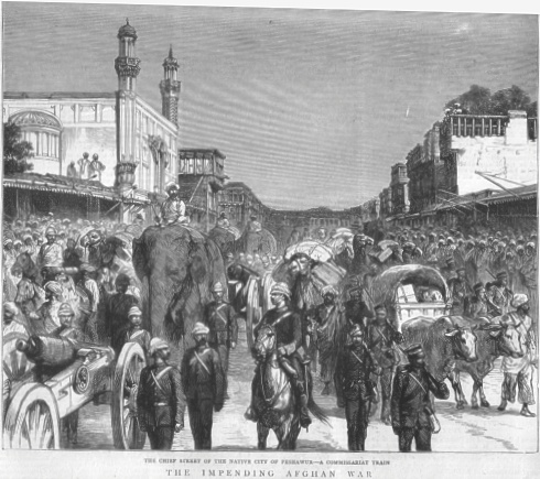 | 38. The Impending Afghan War. The chief street of the native city of Peshawur - A Commissariat train. 1878. Size: 22.5 x 20 cms. Price: $ 14.00 |