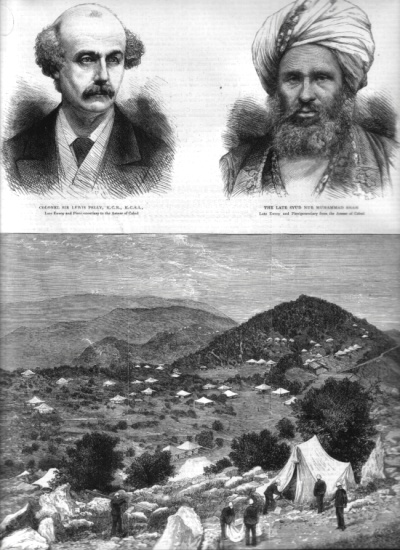 | 45. The Impending Afghan War. Colonel Sir Lewis Pelly; The late Syud Nur Muhammad Sham and British troops encamped in the hills at Cherat. 1878. Size : 22.5 x32 cms. Price: $ 20.00 |