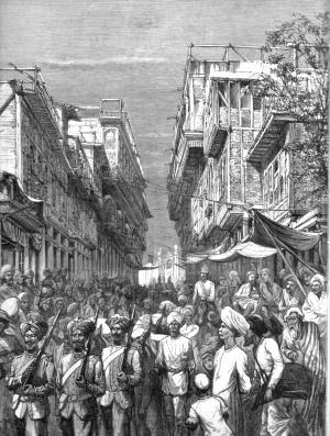 | 6. The Impending Afghan War - A street in Peshawur. 1878. Size: 22.5 x 30 cms. Wide margins. Price: $ 20.00 |