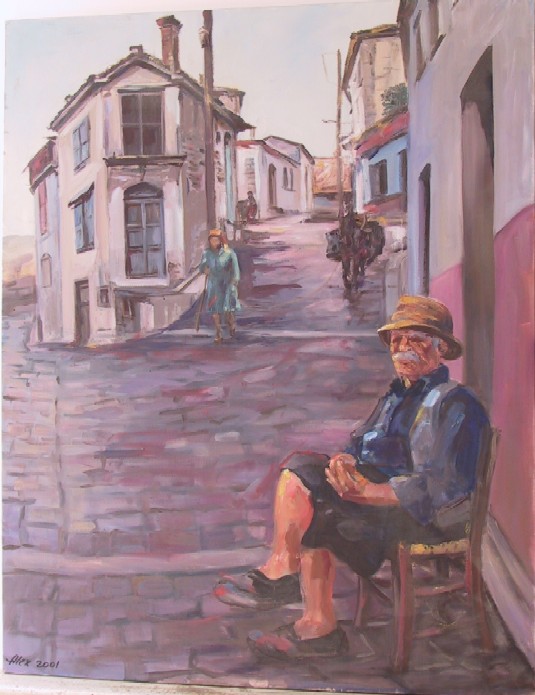 16. Old man seated at village street corner.  75 x 90 cms.  Price: CyP. 275.00