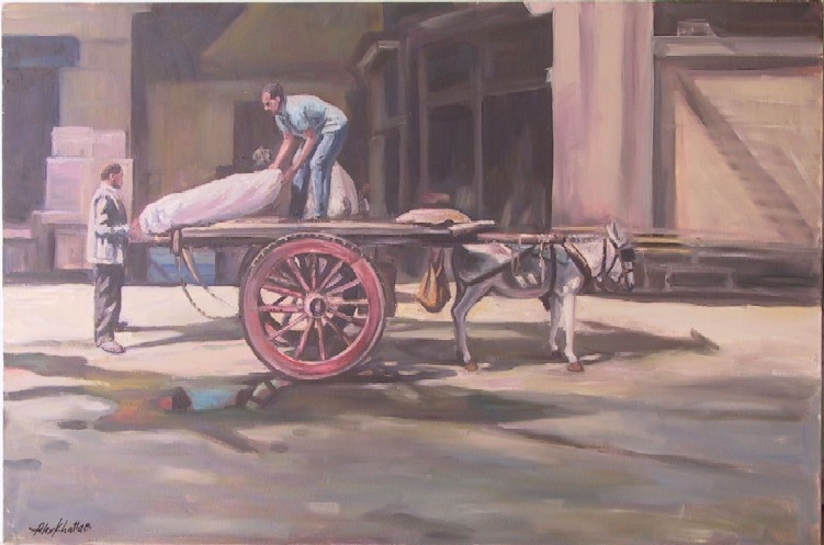 4 Unloading from donkey cart. 90 x 60 cms.     Price: CyP: 225.00