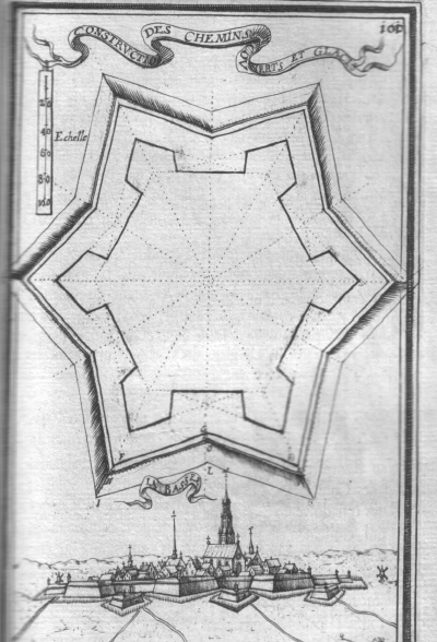 | Costruction des remparts, parapets, portes & fossez des places regulieres. The construction of the ramparts, parapets, gates and ditches of regular places. Surolle. Price: $ 40.00 | Construction des chemins couverts & glacis. The costruction of covered ways and glacis.La Bassee ( in Seine-et-Marne) Price: $ 40.00 |