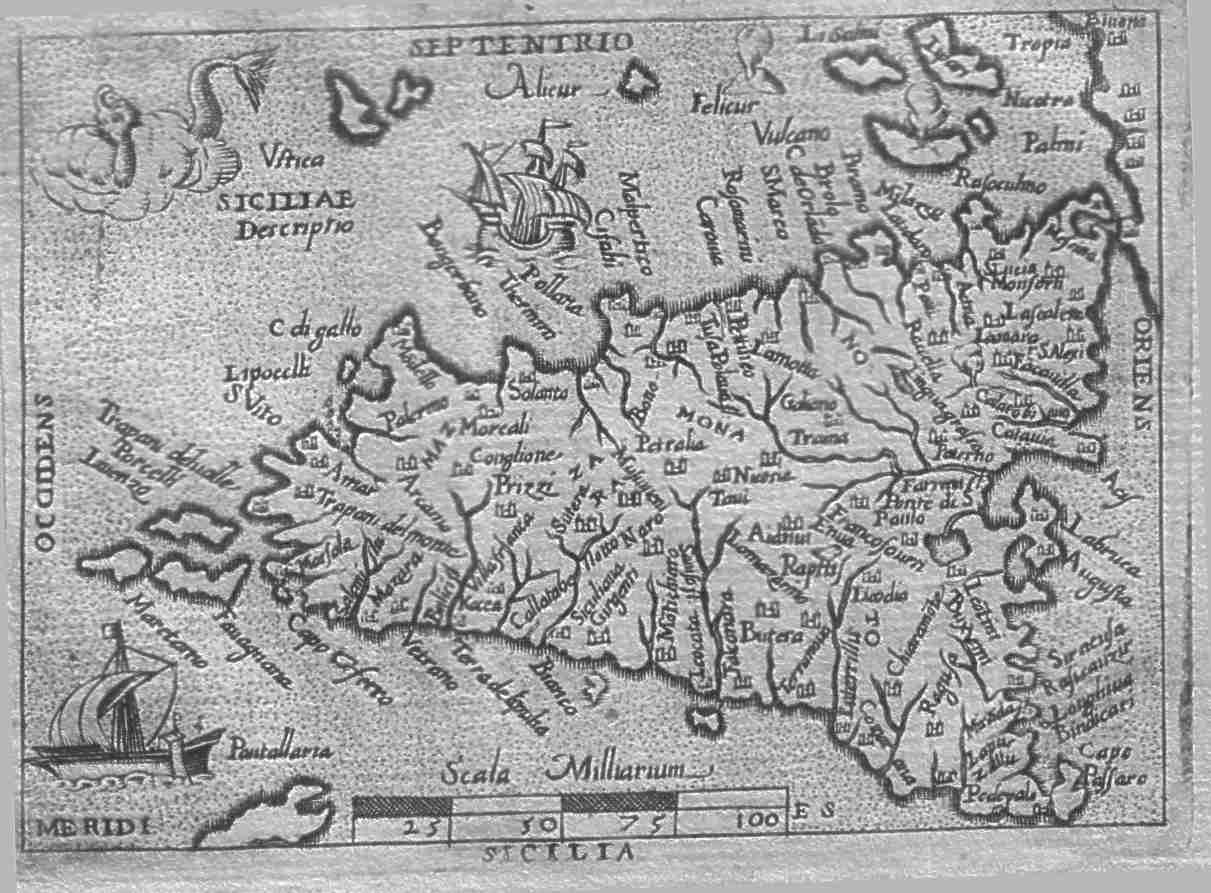 A map of the Island of Sicily with two sailing ships and a sea monster.