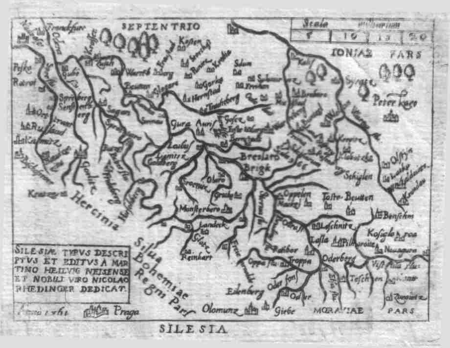 | Silesia Typus Descriptus et editus a Martino Helvig Neisense et nobili vero Nicolao Rhedinger Dedicat. A map of Silesia now belonging to Poland. Dresden and Germany to the west, Moravia, Prague and Czechia to the south. Towns of Wroclaw and Walbrzych and rivers Oder and Vistula noted. Price: $ 95.00 |