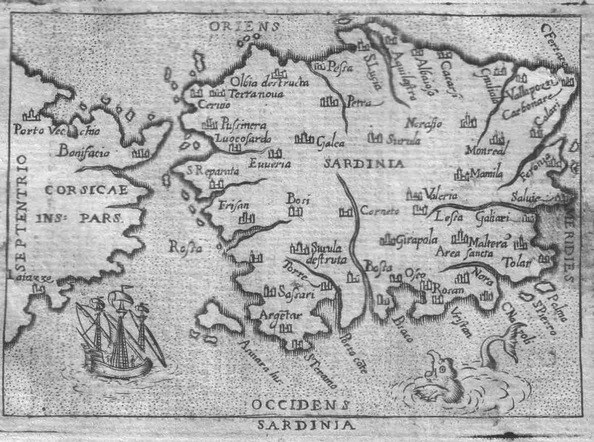 A map of the Island of Sardinia with the north placed on the left. A sailing ship and a sea monster.