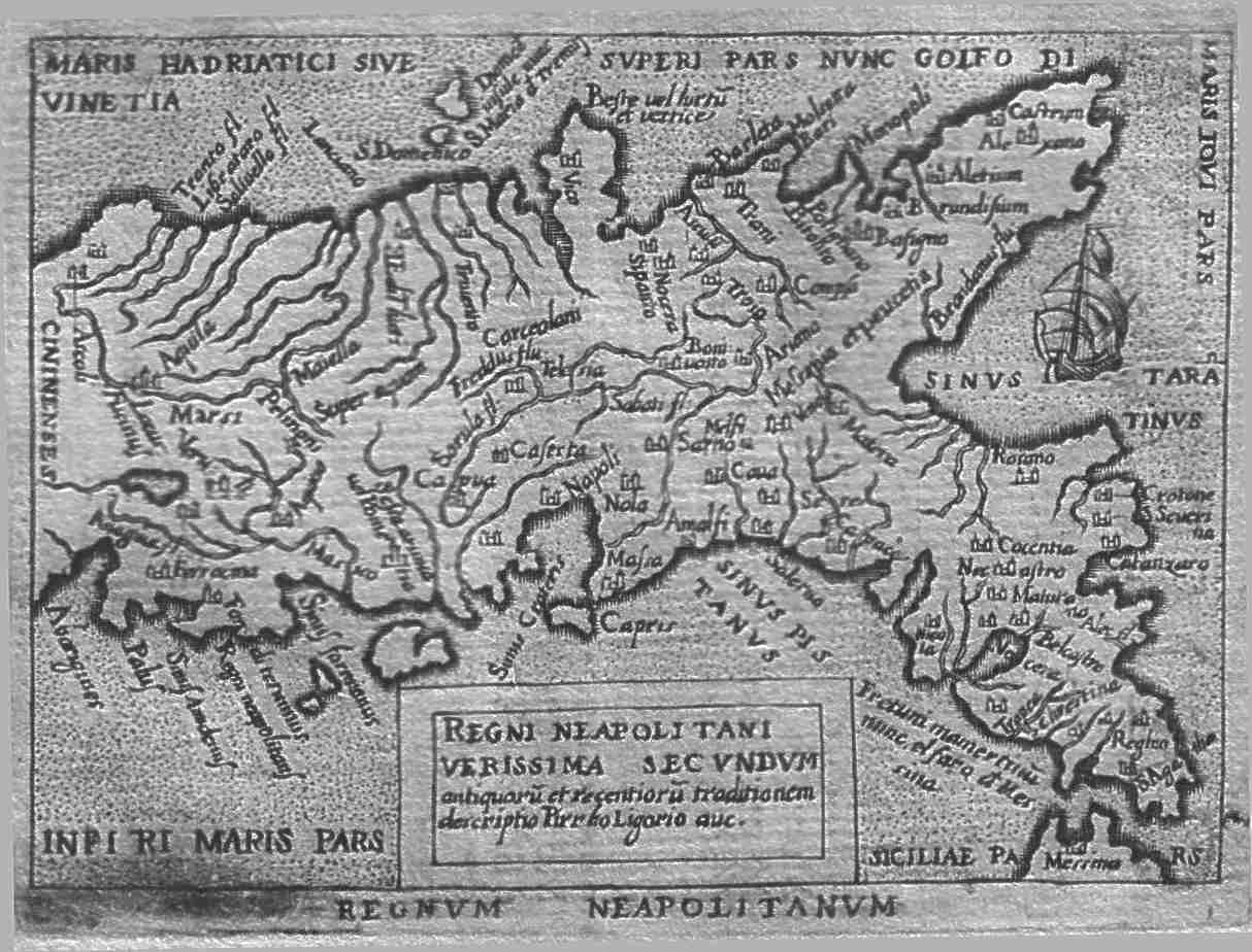 | Regnum Neapolitanum. A map of the provinces of Campania, Basilicata and Calabria with north placed on the left. The Adriatic is in the east, the Gulf of Taranto is in the south, Naples and the Isle of Capri are in the west and Marcianise is in the north. A sailing ship is in the Gulf of Taranto. Price: $ 95.00 |