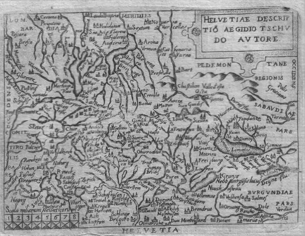 | Helvetiae Descriptio Aegidio Tschudo Autore. An inverted map of Switzerland with the north placed at bottom. Lake Geneva and France in the west, Lake Constance and Germany in the north, Chur, Tyrol and Austria in the east and Italy, Ascona, Lugano and the Matterhorn in the south. Price: $ 180.00 |