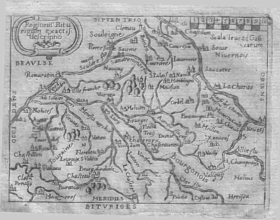 | Regionis Biturigum Exactis Descriptio. A map of the south eastern part (Cher) of the Centre-Val-de-Loire region, the 'heart' , of France. The towns of Vierzon, Bourges, Saint Armand, Berry as well as the 'Unesco' village of La Charite sur Loire noted. Price: $ 95.00 |