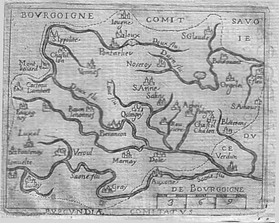 A map of the eastern Burgandy region of France centering on the town of Berancon and the flow of the Soane from the Alps in the east towards central France in the west.