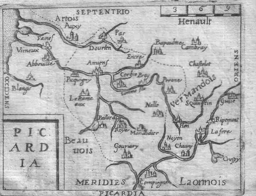 A map of the Picardie region of northern France. The towns of Abbeville, Amiens, Montdidier, Compiegne, Cambray and Saint Quintin are all noted.