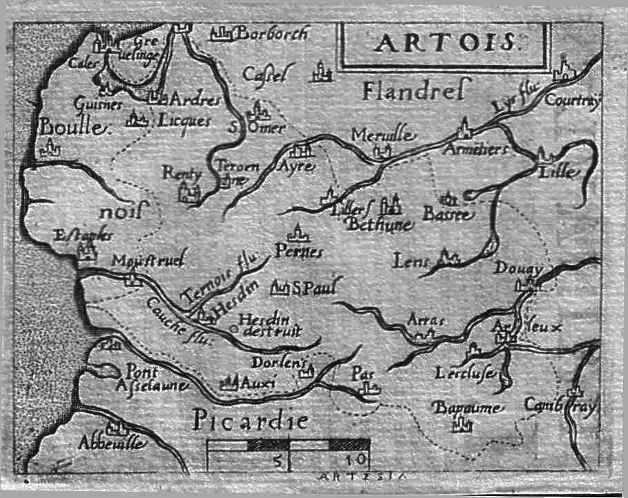 A map of the Nord-Pas-de -Calais region of France, with Flandres in the north. The towns of Calais, St. Omer, Montreuil, Abbeville, Amiens, Lille, Arras and Bethune are all noted.