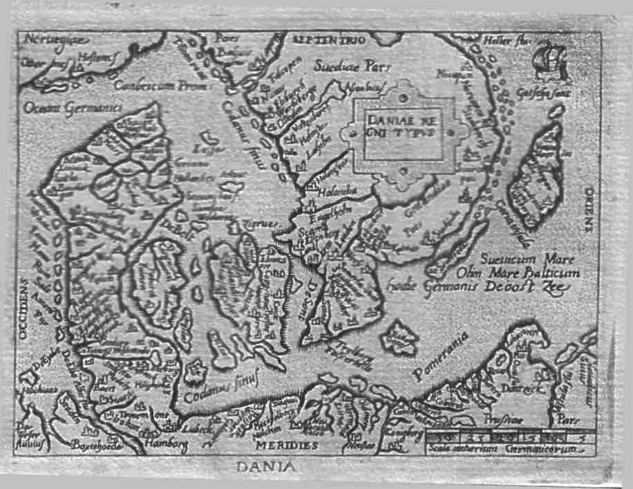 | Daniae Regni Typus. A map of Denmark ( although the greatest part of the map area is taken by Sweden in the north. ). The mouths of the Elbe ( in Germany ) and of the Vistula ( in Poland ) are in the south west and in the south east respectively. Alborg, Arhus and Copenhagen noted. Price: $ 150.00 |
