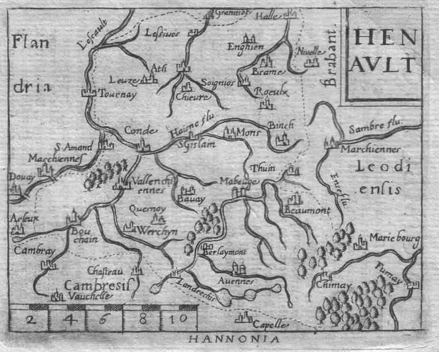 A map of the Hainaut region of Belgium with Flanders in the west, the Brabant in the north, Namur in the east and France in the south.