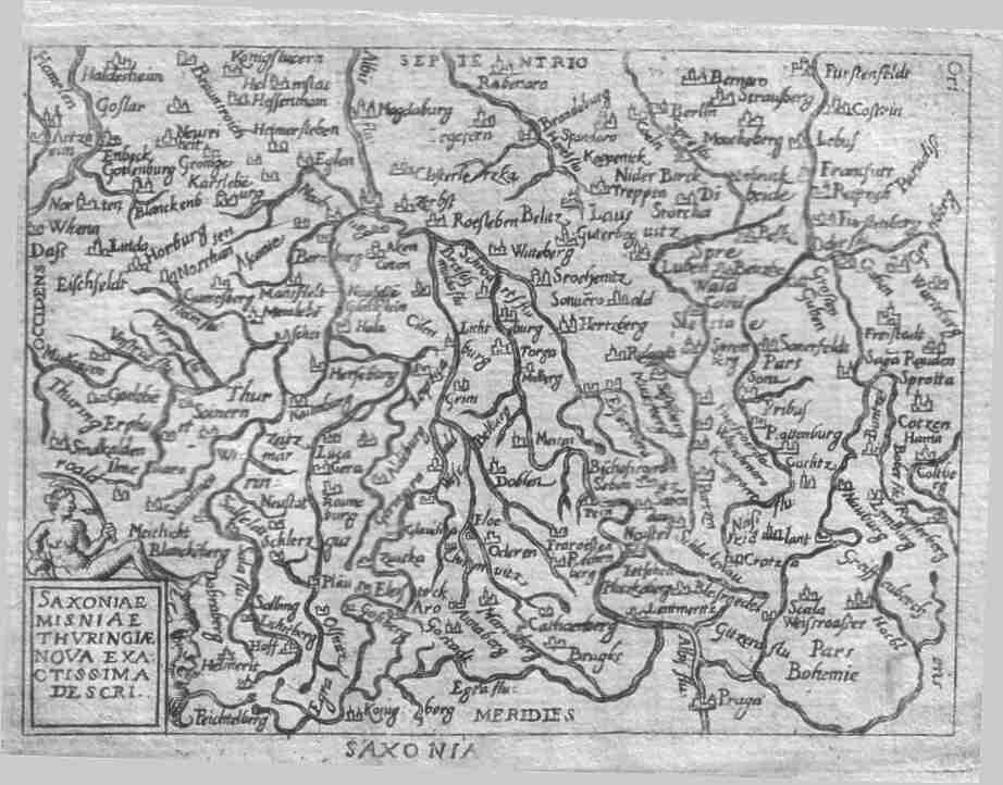 | Saxoniae, Misniae, Thuringiae Nova Exactissima Descri. A map which extends from the border of Silesia in the east , Bohemia with Prague in the extreme south to the Weser river and encompasses the Thuringia and Saxony regions of south eastern Gewrmany. Price: $ 95.00 |