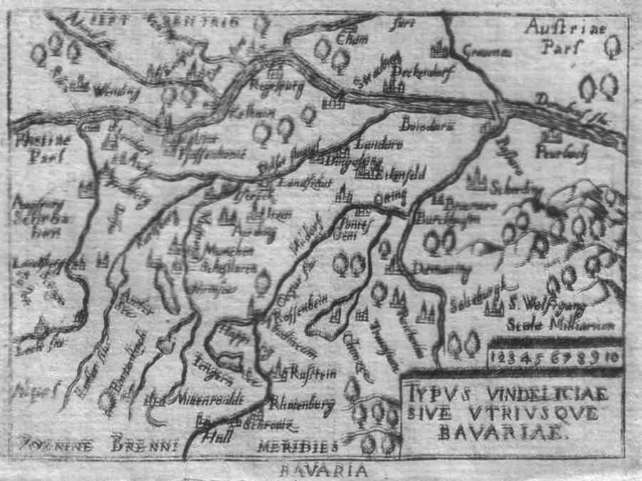 A map of Bavaria with Regensburg in the north and Austria in the east, which includes the towns of Munchen, Augsburg, Msalzburg, Ingolstadt and Pasaw. Severe offsetting hence,