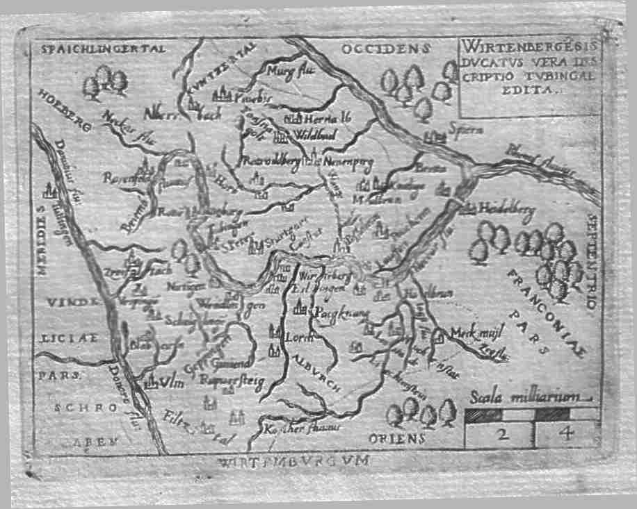 | Wirtenbergesis Ducatus vera Descriptio Tubingae Edita. A map of southwest Bavaria with north placed on the right. The Rhine and the towns of Heidelberg and Spier in the north and the town of Ulm and the Danube in the south; Stuttgart in the center. Price: $ 95.00 |