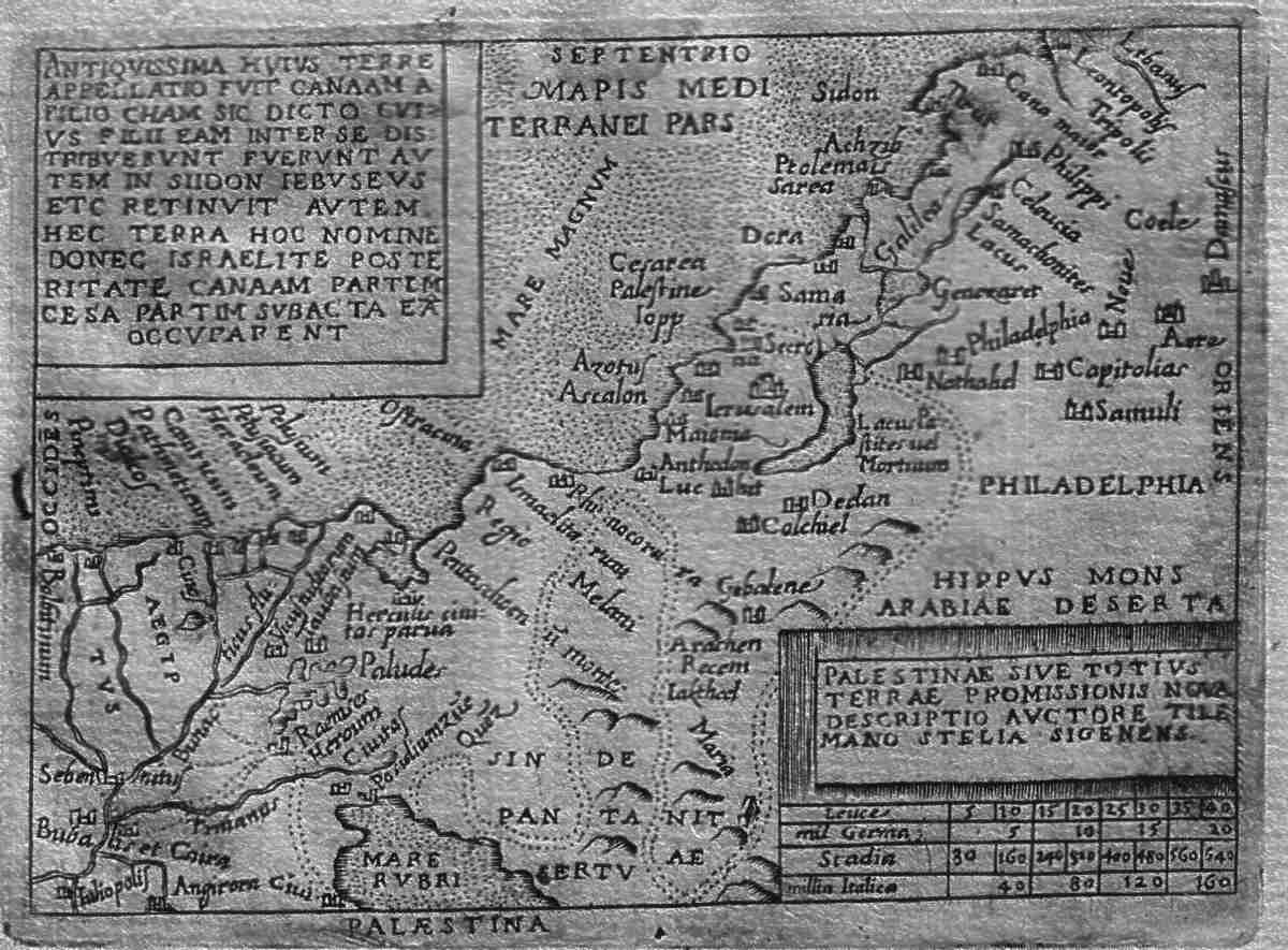 | Palestinae sive Totius Terrae Promissionis Nova Descriptio Autore Tile Mano Stelia Sigenens. The map covers the area between Egypt and the Nile Delta in the west to Syria and Jordan in the east, the Lebanon and eastern Mediterranean in the the north to the Red Sea and the Arabian desert in the south. Price: $ 220.00 |