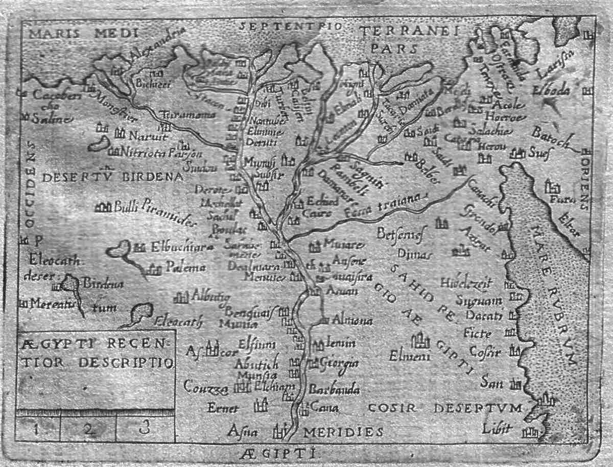 | Aegypti Recentior Descriptio. A map of lower Egypt covering the area from Alexandria in the west to the Sinai, Port Suez and the Red Sea in the east; Deshesheh, Herakleopolis and el Hiba in the south. Detailed siting of towns along the Nile and Red Sea ports. Price: $ 160.00 |