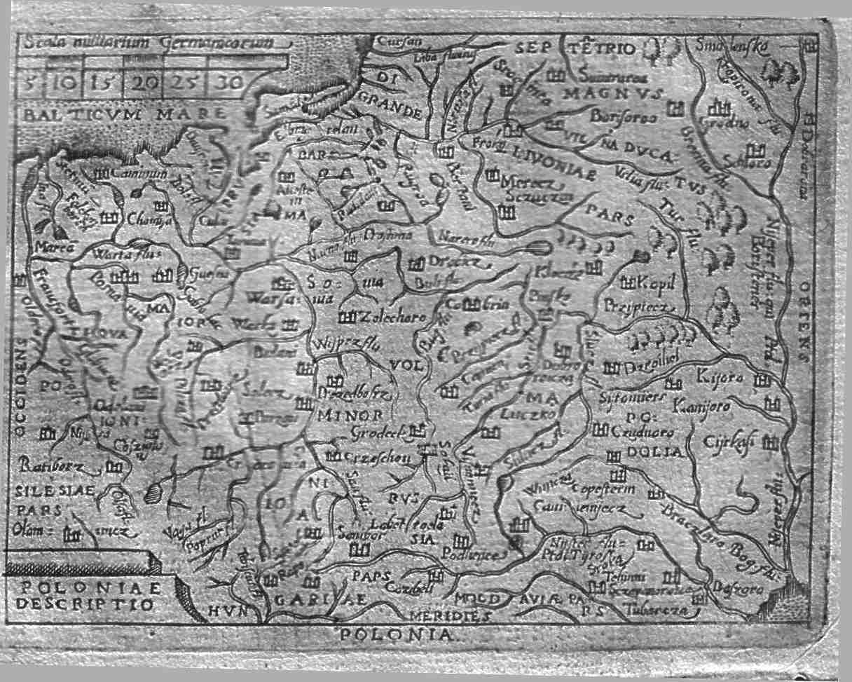 | Polonia Descriptio. A map of Poland covering the region of Silesia in the west to Belarus, Lithuania, Russia and Ukraine in the east and the Baltic Sea and Pomerania in the north to Hungary, Czechoslovakia and Moldavia in the south. The Vistula, Warcaw, Gdnask, Krakow and Wroclaw noted. Price: $ 150.00 |