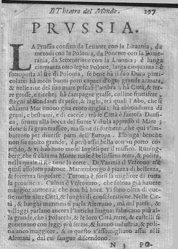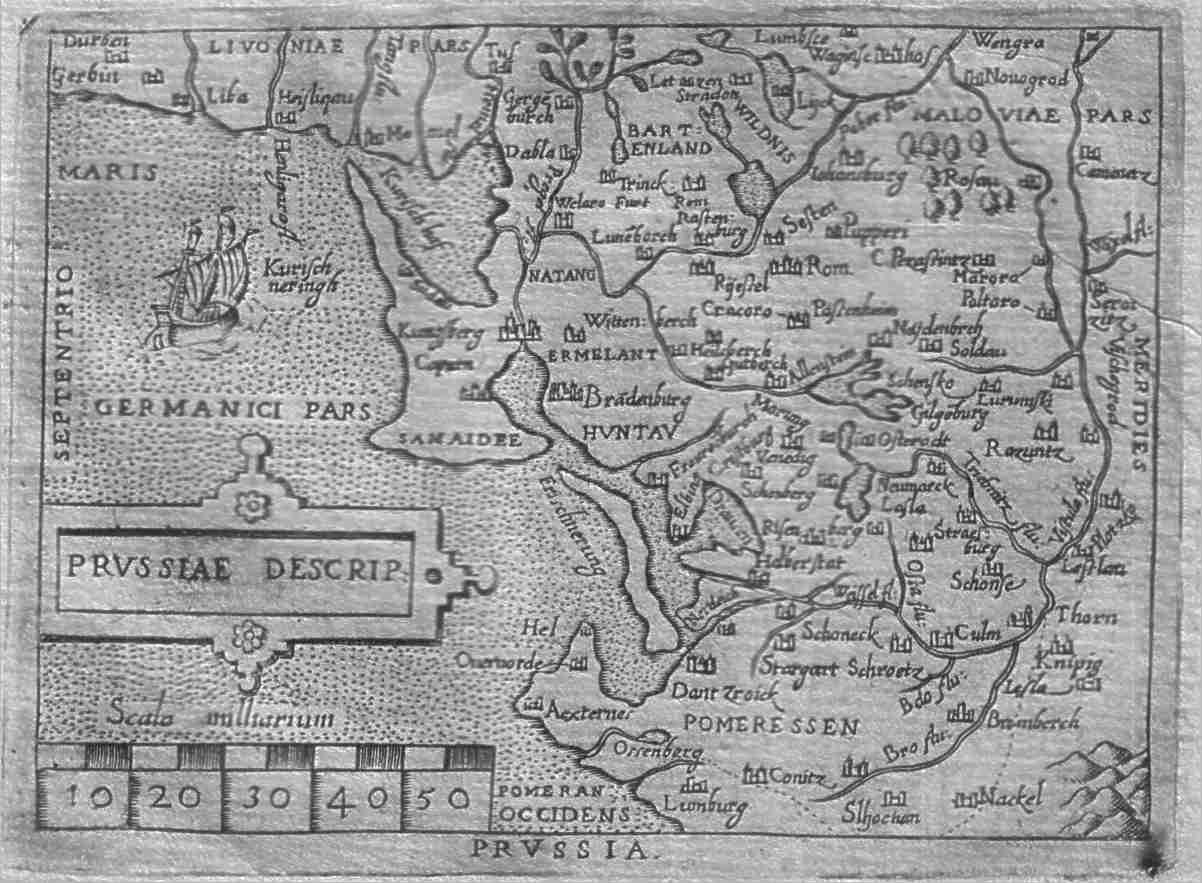 | Prussiae Descrip. A map of north eastern Poland with Russia and the Baltic in the north, Lithuania and Belarus in the east and the Vistula in the south. Gdansk noted. The map has north placed on the left. Decorative cartouche and a sailing ship in the Baltic. Price: $ 150.00 |