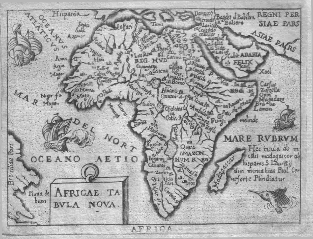 | Africa Tabula Nova. An acurate and detailed map of Africa adorned by three sailing ships, a sea monster and a cartouche. Rivers, lakes, towns and regions given in much detail; the coast of Brazil to the west. Oceanus Atlanticus, Mar del Nort Oceano Aetio and Mare Rubrum given. Price: $ 280.00 |